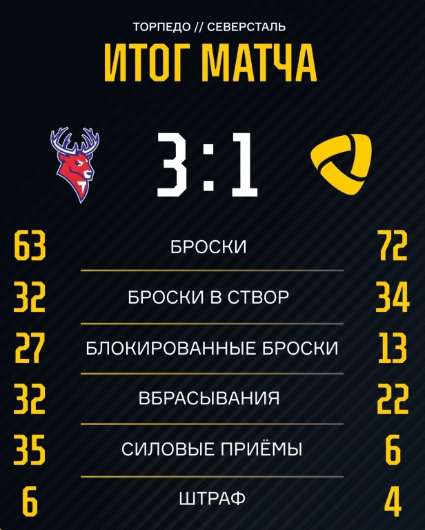 Матч «Торпедо» - «Северсталь» завершился со счетом – 3:1 (1:0, 1:1, 1:0).