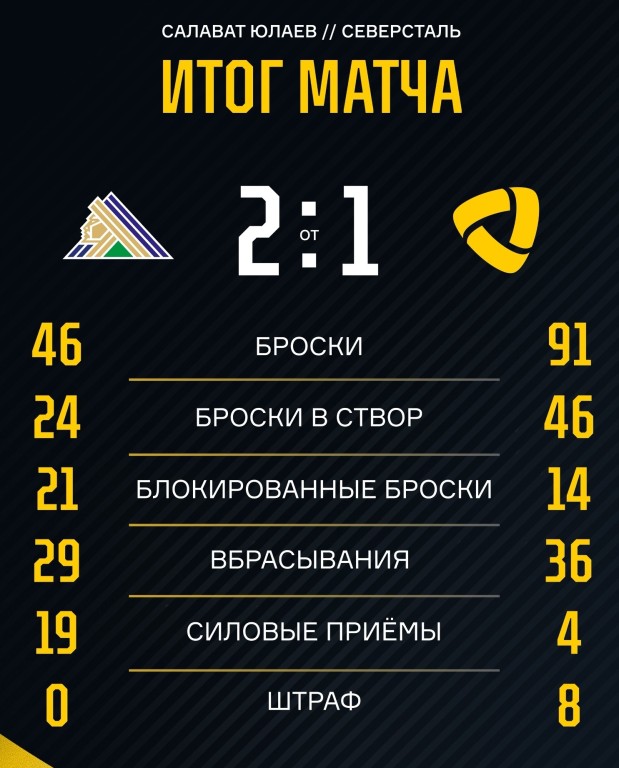 Второй в сезоне матч «Салават Юлаев» - «Северсталь» завершился, как и первый, со счетом – 2:1 (0:0, 0:0, 1:1, 0:0, 1:0).