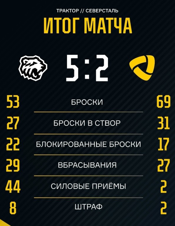 - 46:05 – 5:1 «Трактор» Максим Джиошвили (Михал Чайковски, Джордан Гросс).