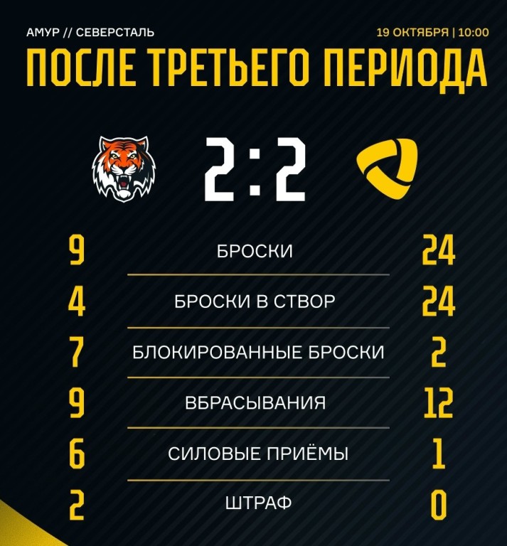 Матч «Амур» - «Северсталь» завершился со счетом 2:3 Б (0:1, 2:0, 0:1, 0:0, 0:1). Решающую шайбу в буллитной серии забросил Михаил Ильин.