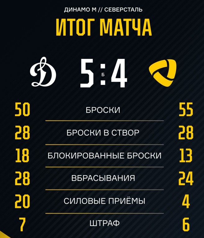 Матч «Динамо»-Москва - «Северсталь» завершился со счетом – 5:4 Б (1:0, 1:0, 2:4, 0:0, 1:0).