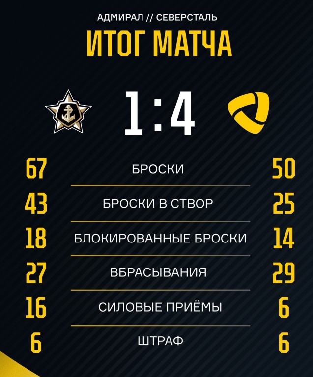 Матч «Адмирал» - «Северсталь» завершился со счетом - 1:4 (0:0, 0:2, 1:2).