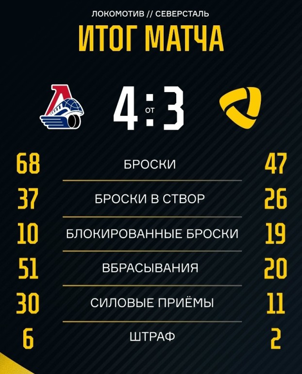 Матч «Локомотив» - «Северсталь» завершился со счетом – 4:3 ОТ (2:1, 0:1, 1:1, 1:0).