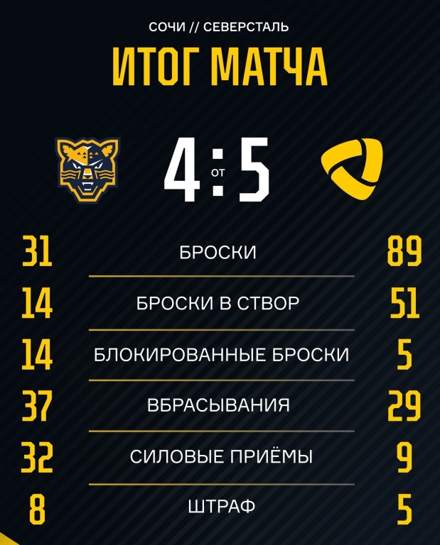 Матч ХК «Сочи» - «Северсталь» завершился со счетом – 4:5 ОТ (1:2, 3:0, 0:2, 0:1).