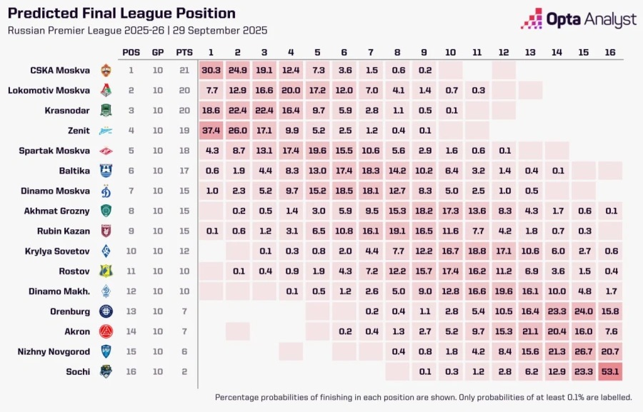 Впрочем, несмотря на промежуточное 4-е место «Зенита», суперкомпьютер британской компании Opta Sports, которая занимается спортивной аналитикой по 30+ видам спорта в 70 странах, считает именно «сине-бело-голубых» главными фаворитами в чемпионской гонке. ЭВМ, учитывающая сразу несколько показателей, – рейтинг клубов, статистику игроков, исторический перформанс (историю встреч) и букмекерские коэффициенты, считает победу команды с берегов Невы вероятной на 37,4%. На втором месте в этом рейтинге ЦСКА – 30,3%, а замыкает «тройку» ФК «Краснодар» – 18,6%.