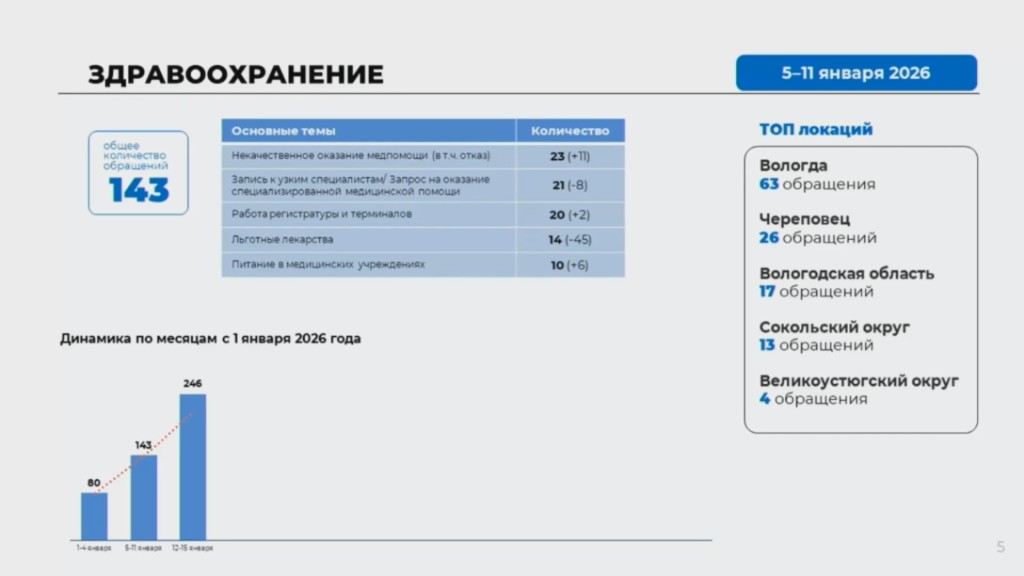 Министр здравоохранения Вологодской области Николай Гонтюрёв в ходе оперативного совещания доложил о ситуации в области медицины, прокомментировав жалобы вологжан. Всего за отчётный период (5-11 января) в сфере здравоохранения было зафиксировано 204 жалобы (на 17 % меньше, чем за прошлый отчётный период).
