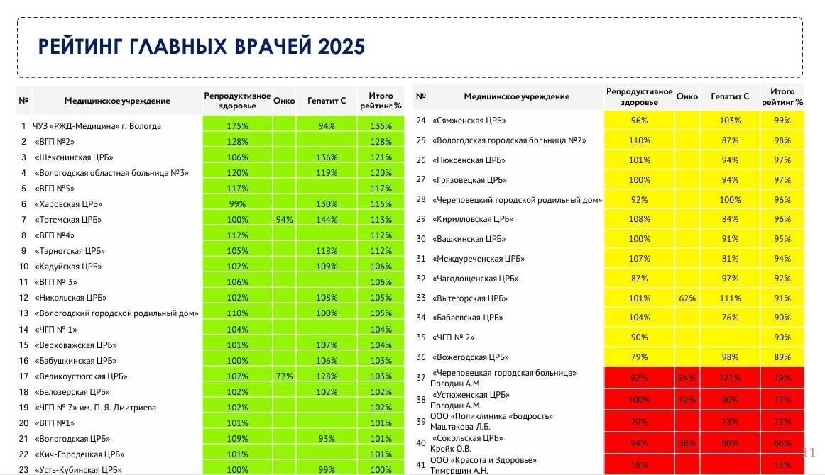 Губернатор Вологодской области Георгий Филимонов опубликовал в своих социальных сетях рейтинг эффективности руководителей медицинских учреждений региона за 2025 год. В основу оценки легли три ключевых направления: показатели по репродуктивному здоровью, онкологической помощи и борьбе с гепатитом С.