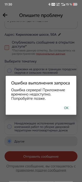 "Ваше приложение "Вологодский городовой" по-прежнему не работает. К сожалению, ничего не исправлено. Вы говорите "исправлено", а по факту не исправлено, вот вам скриншот. Скажите, пожалуйста, когда будет работать, только не говорите мне, что у вас опять работает, просто когда будет работать?" - добивались несколько дней активисты, пытавшиеся поделиться своей коммунальной болью.
