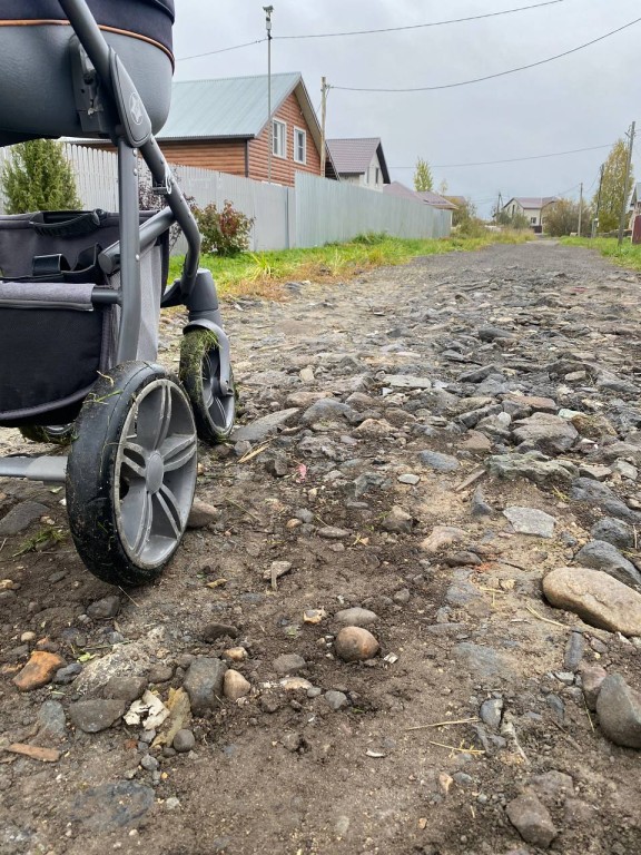 По словам девушки, она едва может выйти на улицу - по дороге невозможно дойти до поликлиники, так как из-за грунта крупной фракции ей приходится тащить коляску с ребенком буквально на себе.